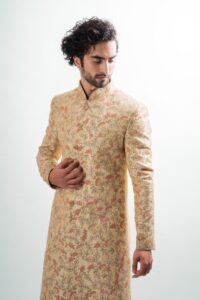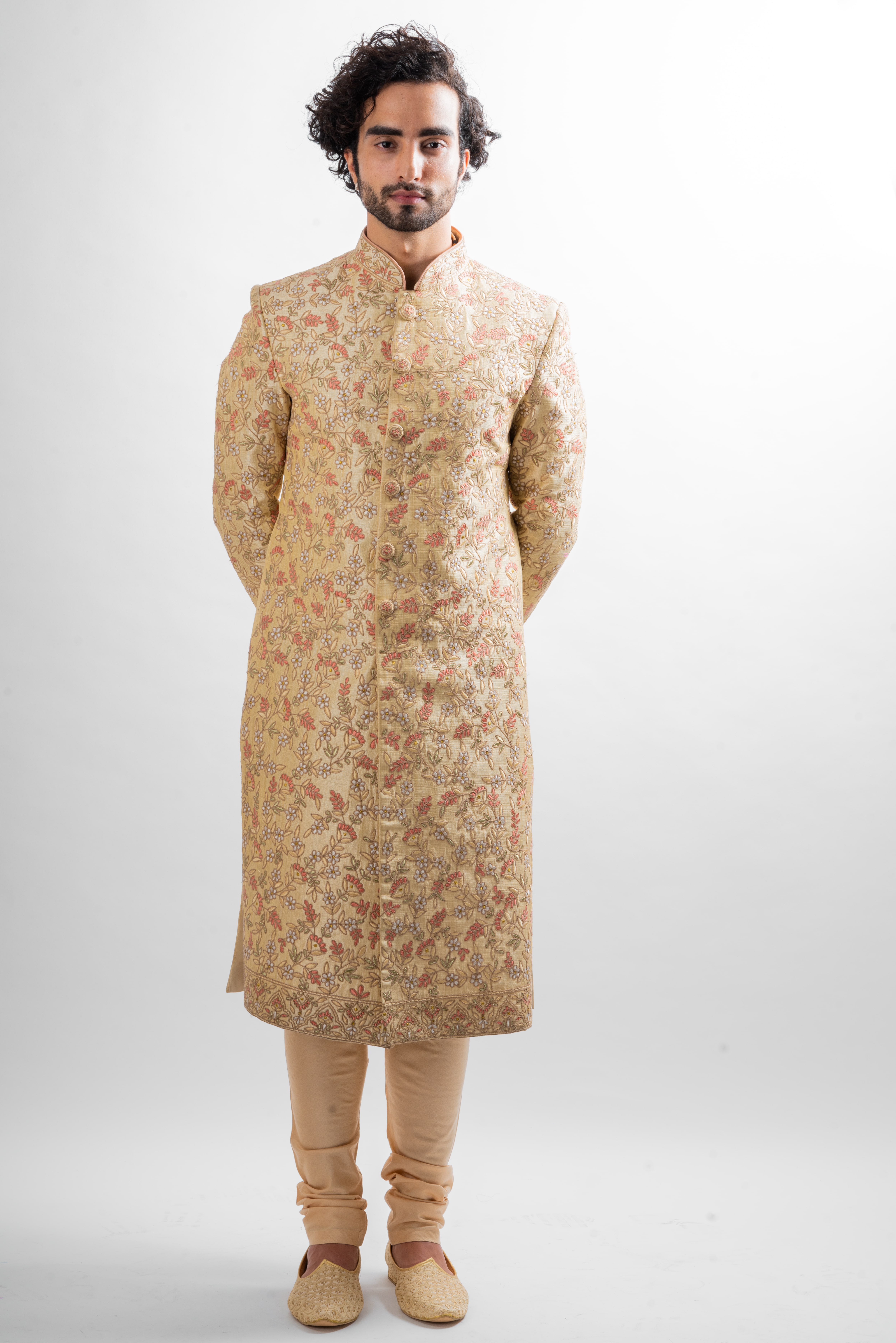 Look graceful and refined with our Beige Floral Embroidered Sherwani Set. Perfect for weddings, receptions, and festive events, this sherwani blends soft beige tones with elegant floral embroidery for a classic and charming look. Ideal for grooms who prefer understated luxury with a timeless feel.