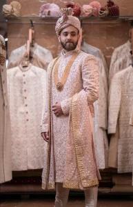 Step into your special day with confidence in the Blush Gold Regal Sherwani Ensemble. Perfect for weddings, receptions, and grand celebrations, this sherwani combines warm blush tones with luxurious golden embroidery for a look that’s both majestic and modern. Ideal for grooms who appreciate richness, refinement, and a royal flair.