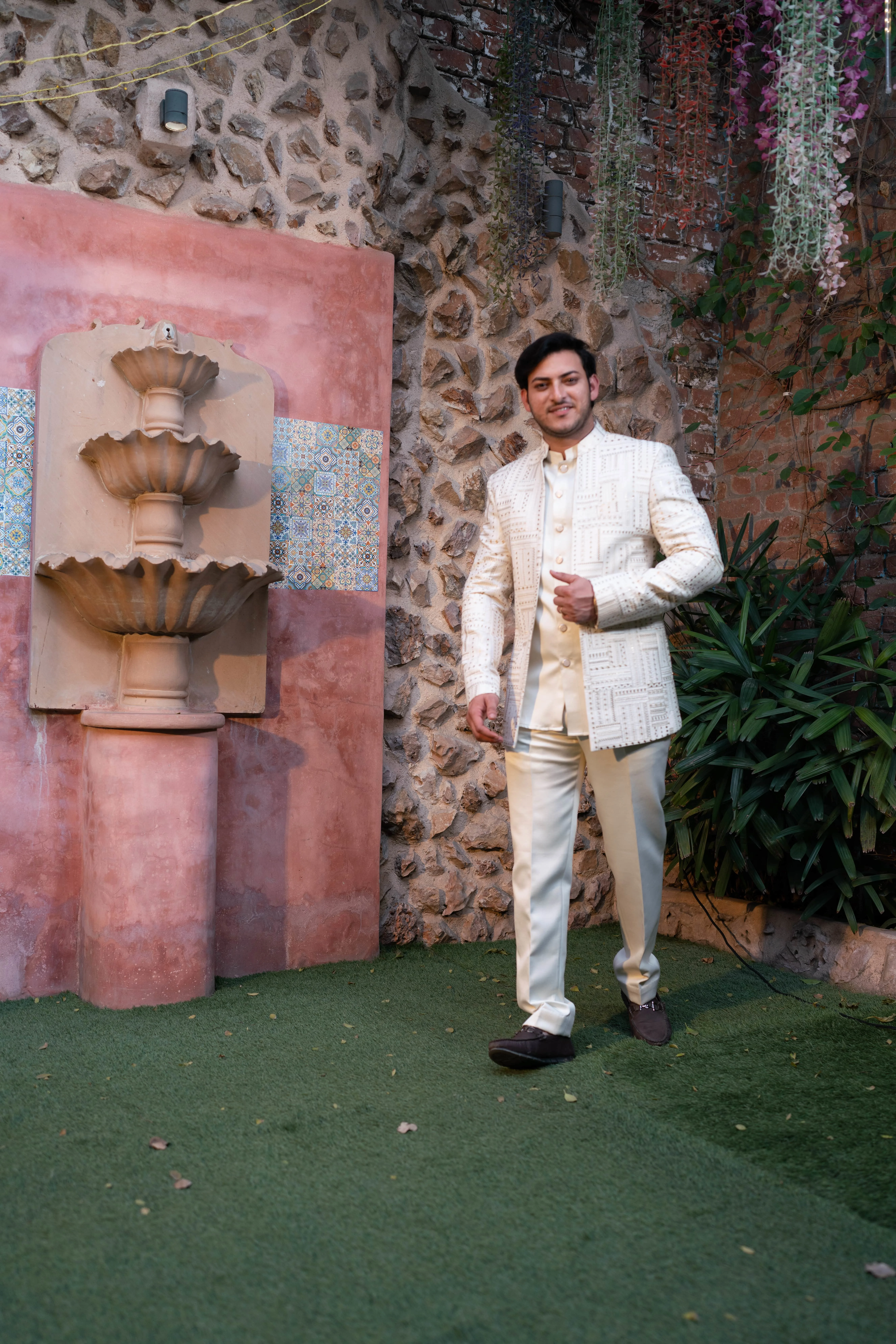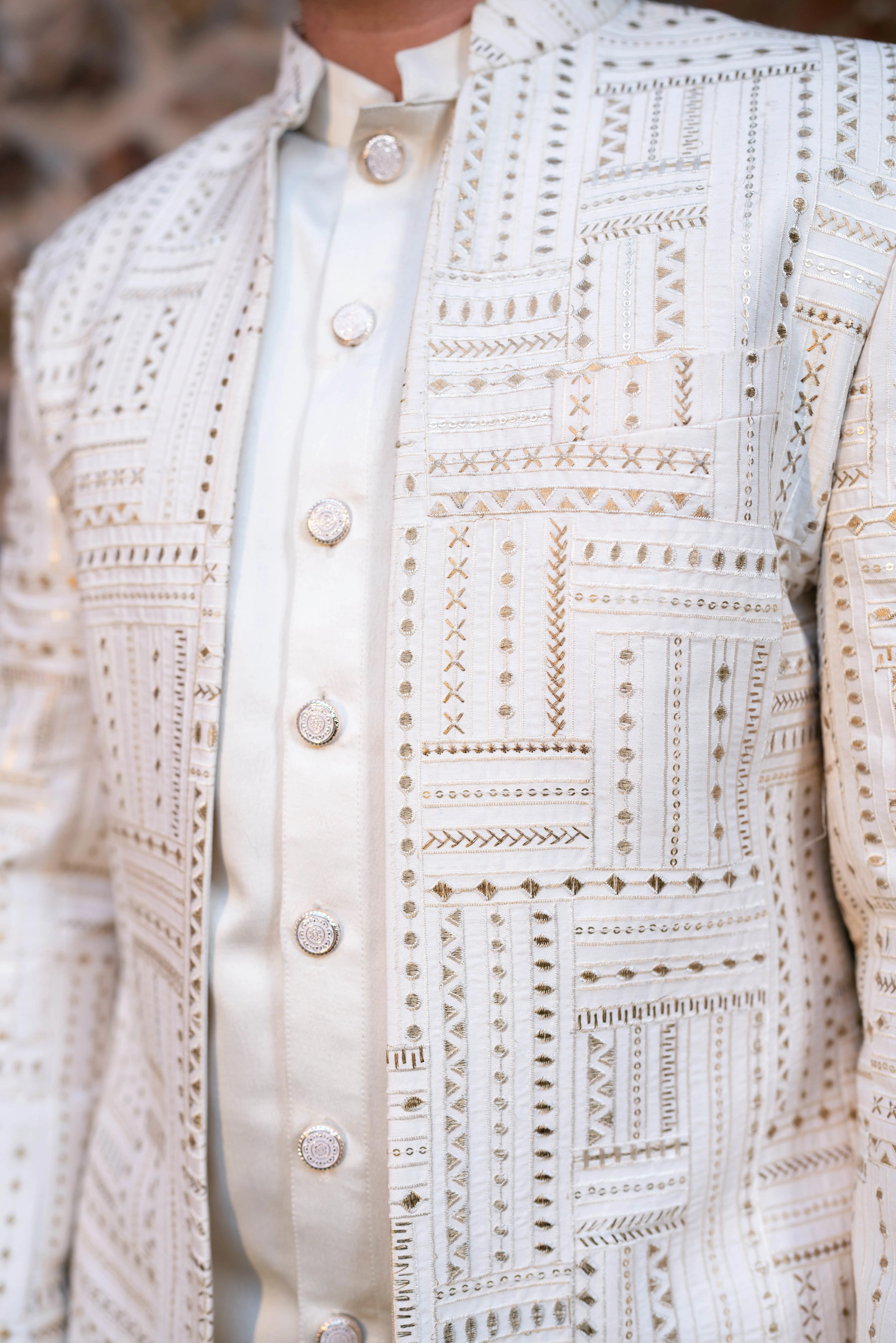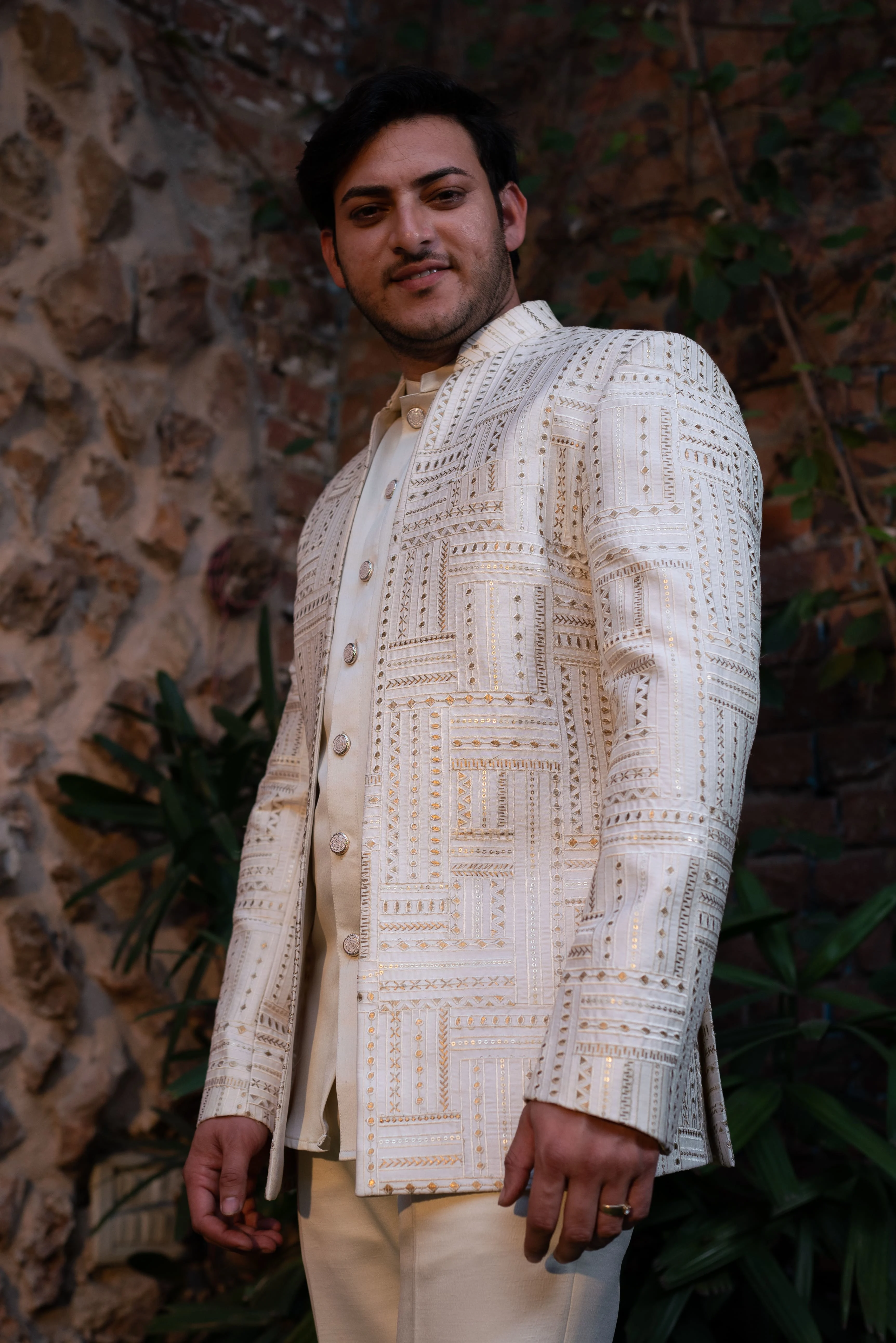 Step into elegance with our Champagne Maze Textured Bandhgala for Men. This sophisticated suit is designed for those who appreciate timeless style and refined detail. The subtle champagne tone combined with a unique maze texture brings a contemporary flair to traditional attire, making it a perfect pick for weddings, receptions, and special celebrations.
