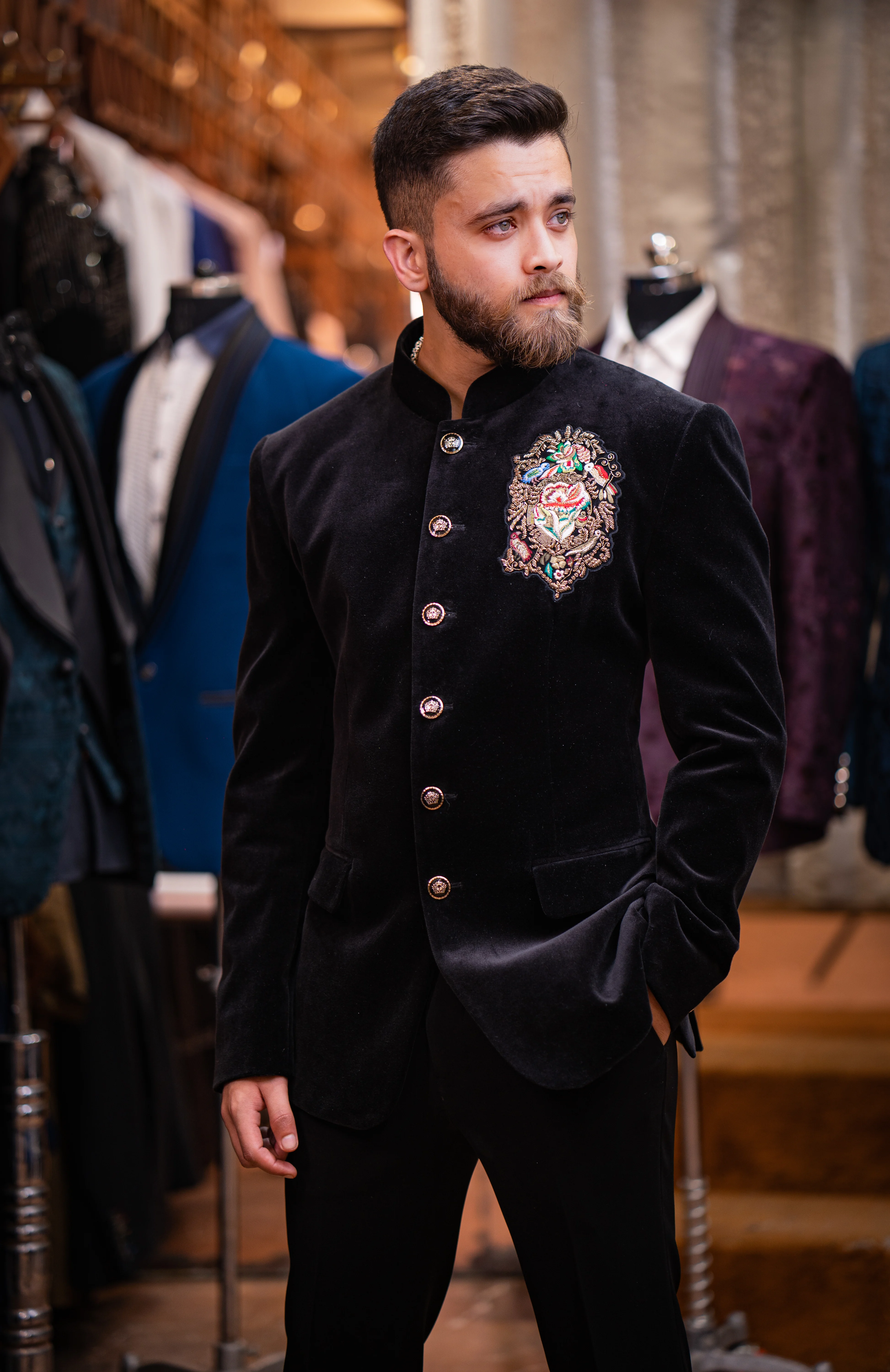 Make a powerful impression with our Designer Black Bandhgala Suit with Embroidered Crest. Perfect for weddings, receptions, and formal events, this suit blends classic elegance with modern style. The deep black hue offers a timeless look, while the embroidered crest adds a unique and royal touch.