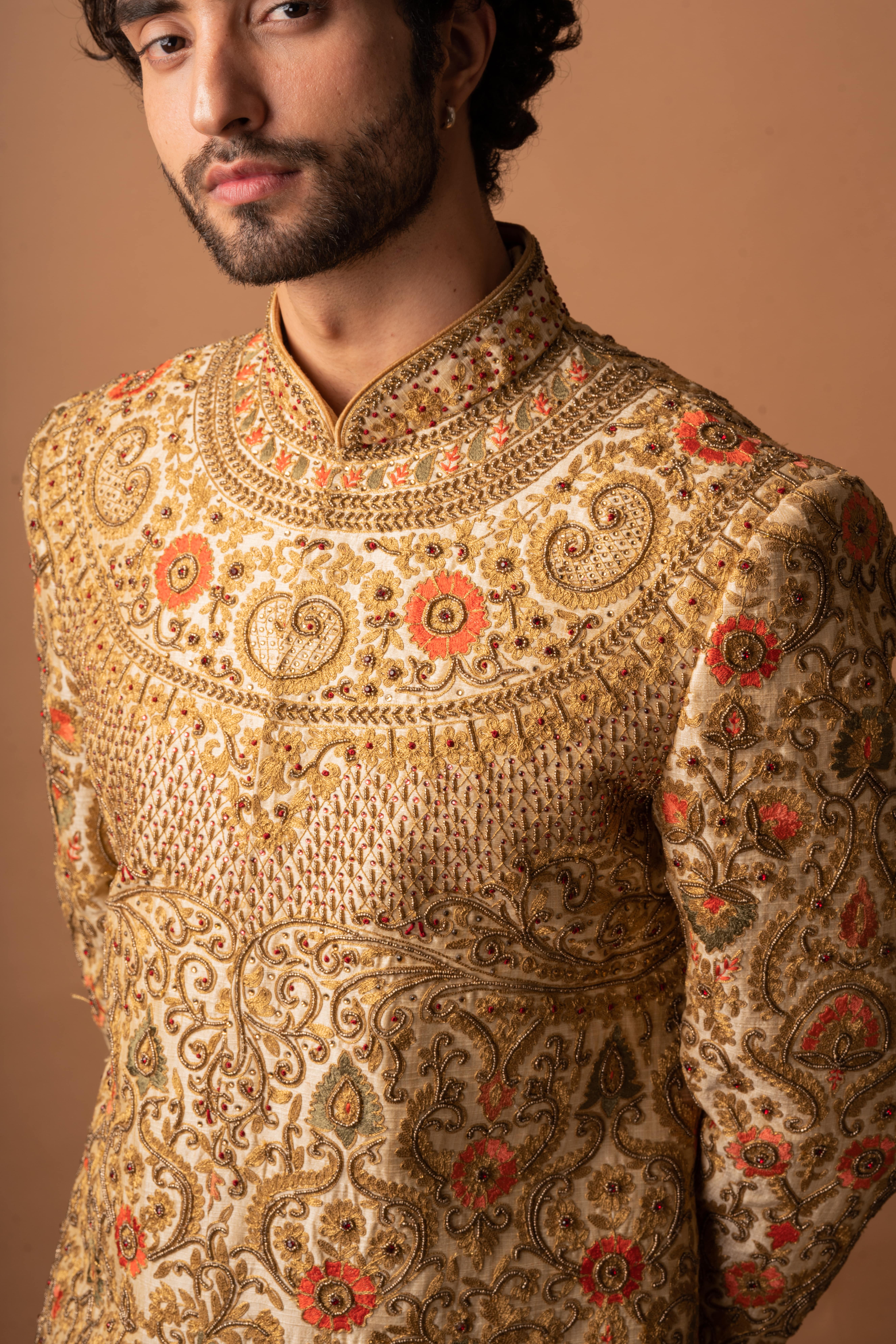 Make a bold and majestic impression with our Heavily Embroidered Royal Sherwani. Perfect for weddings and regal celebrations, this sherwani showcases detailed craftsmanship and luxurious design. The rich fabric combined with intricate embroidery gives it a powerful and traditional appeal, making it ideal for grooms who want to look royal on their big day.