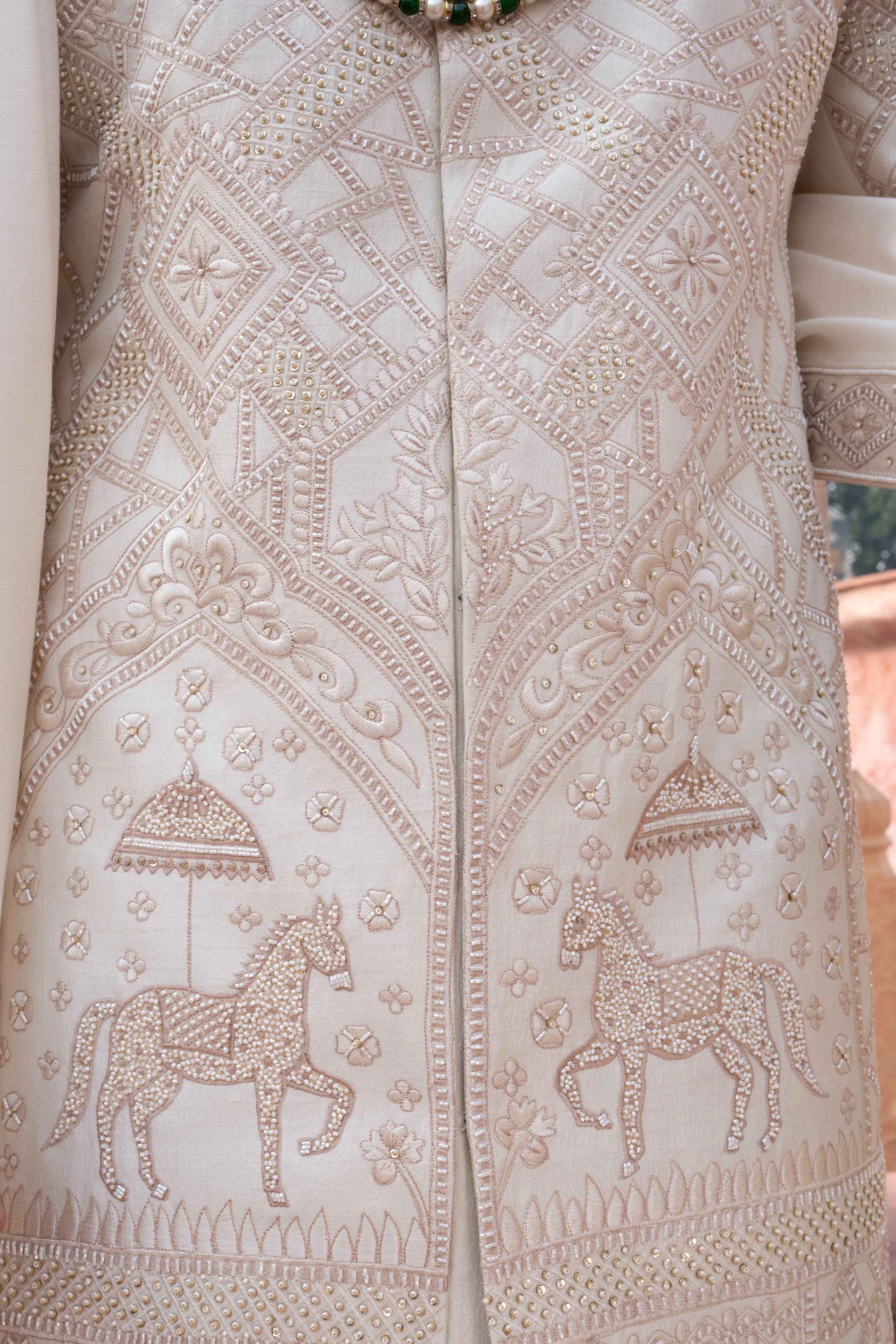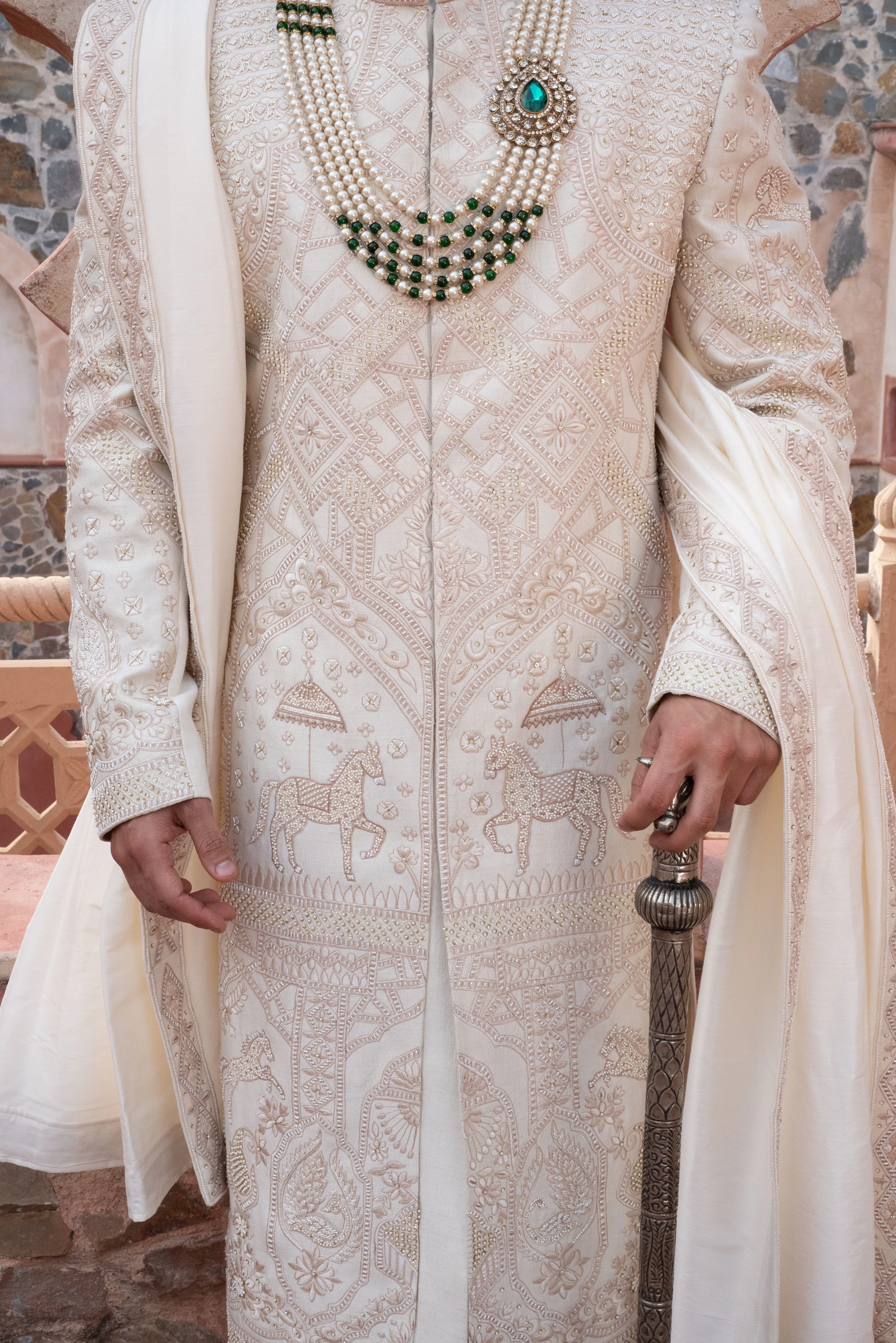 Perfect for grooms who appreciate classic sophistication, this sherwani features detailed hand embroidery on a rich ivory base—making it an impeccable choice for weddings, receptions, and traditional events. The luxurious texture and refined silhouette reflect royal heritage with a modern finish.