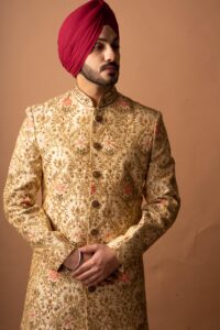Add a touch of timeless grace to your special day with our Ivory Gold Threadwork Sherwani. Designed for weddings and grand occasions, this sherwani blends subtle ivory tones with elegant gold threadwork, offering a perfect mix of simplicity and luxury. Ideal for grooms who appreciate fine craftsmanship and classic style.
