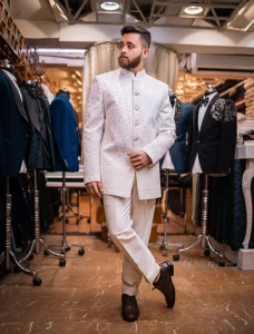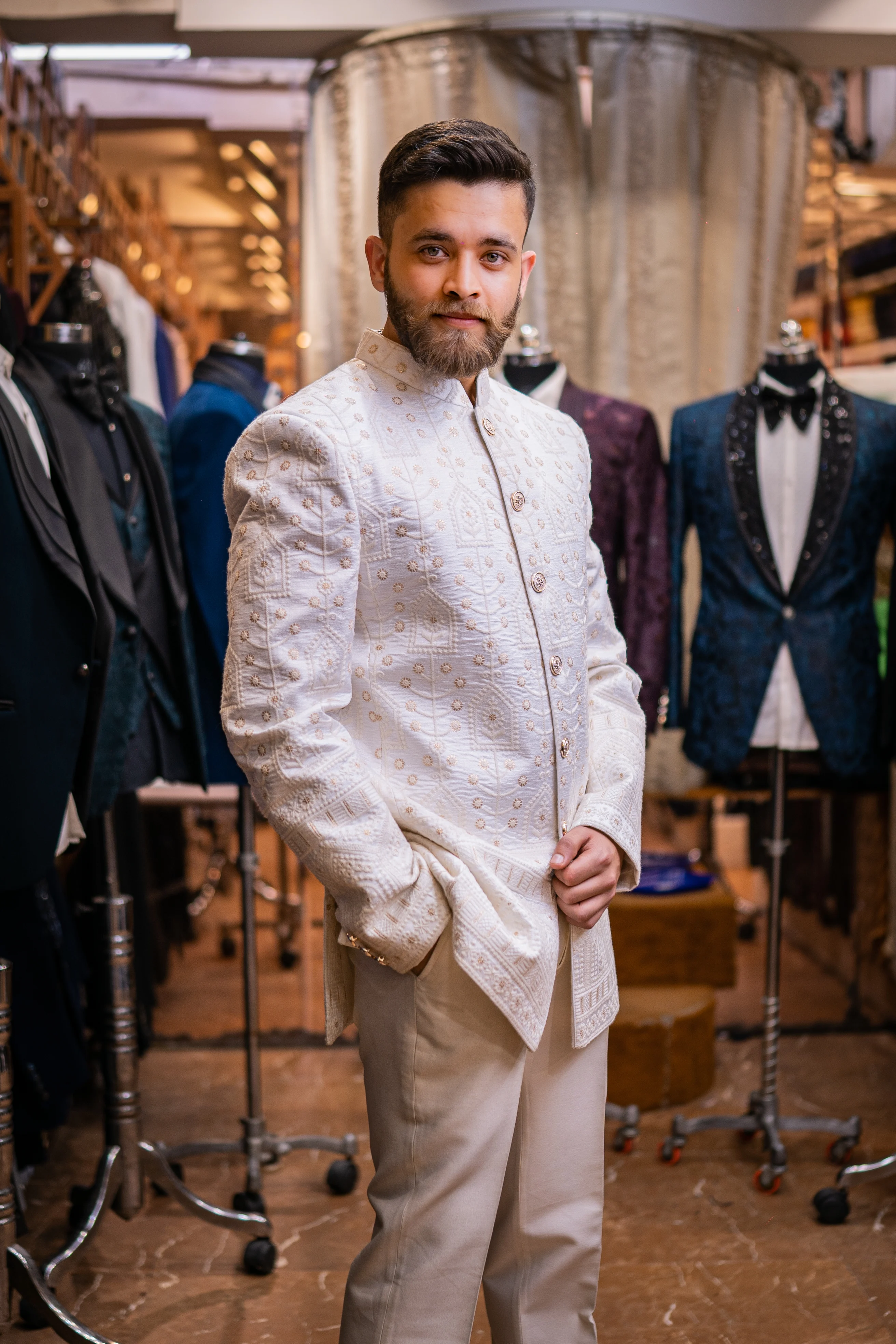 Step out in style with our Ivory Textured Bandhgala Suit for Men. Perfect for weddings, receptions, and formal gatherings, this suit blends timeless elegance with modern tailoring. The soft ivory tone gives a regal charm, while the textured fabric adds depth and sophistication to your look.
