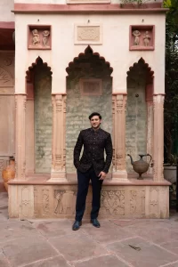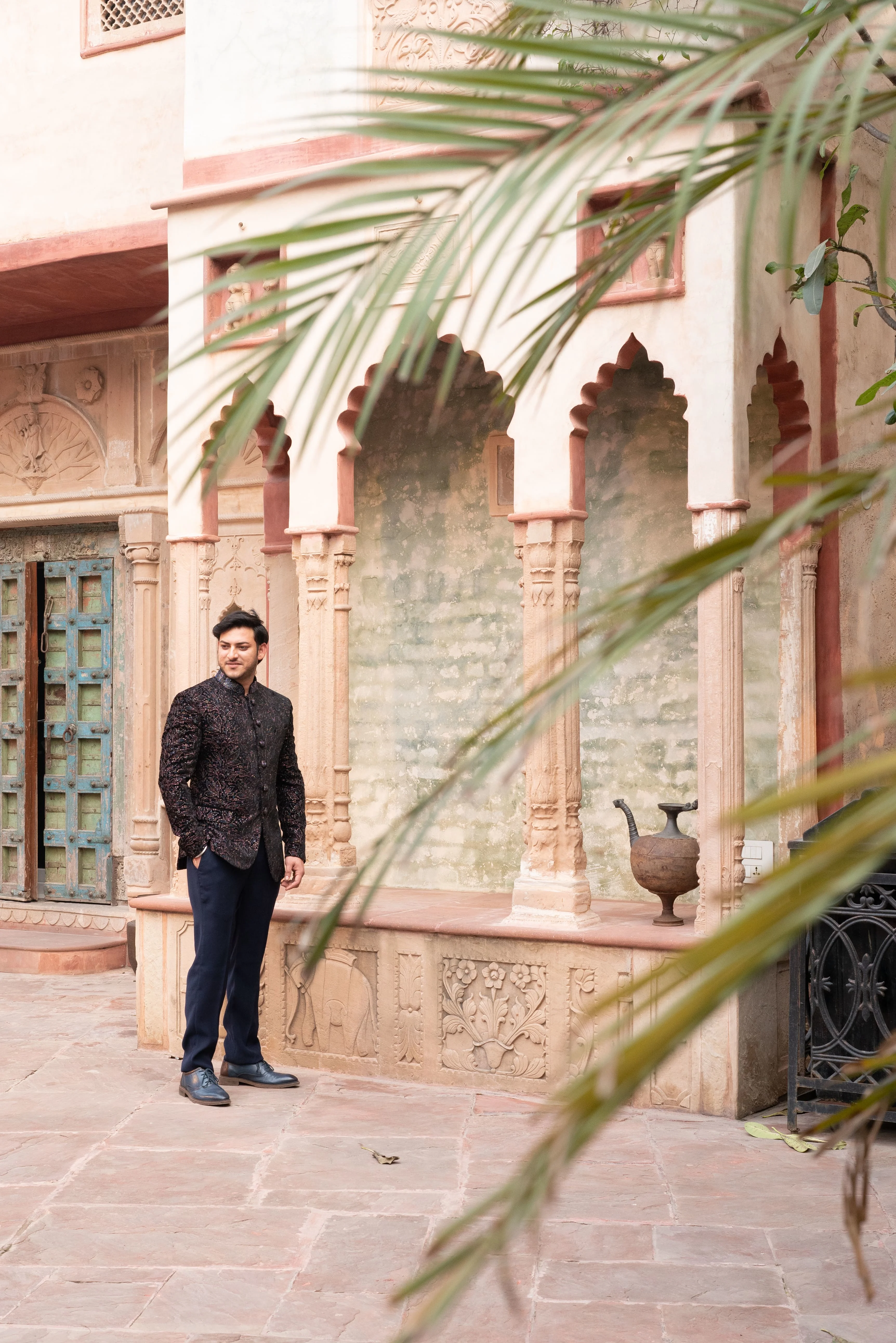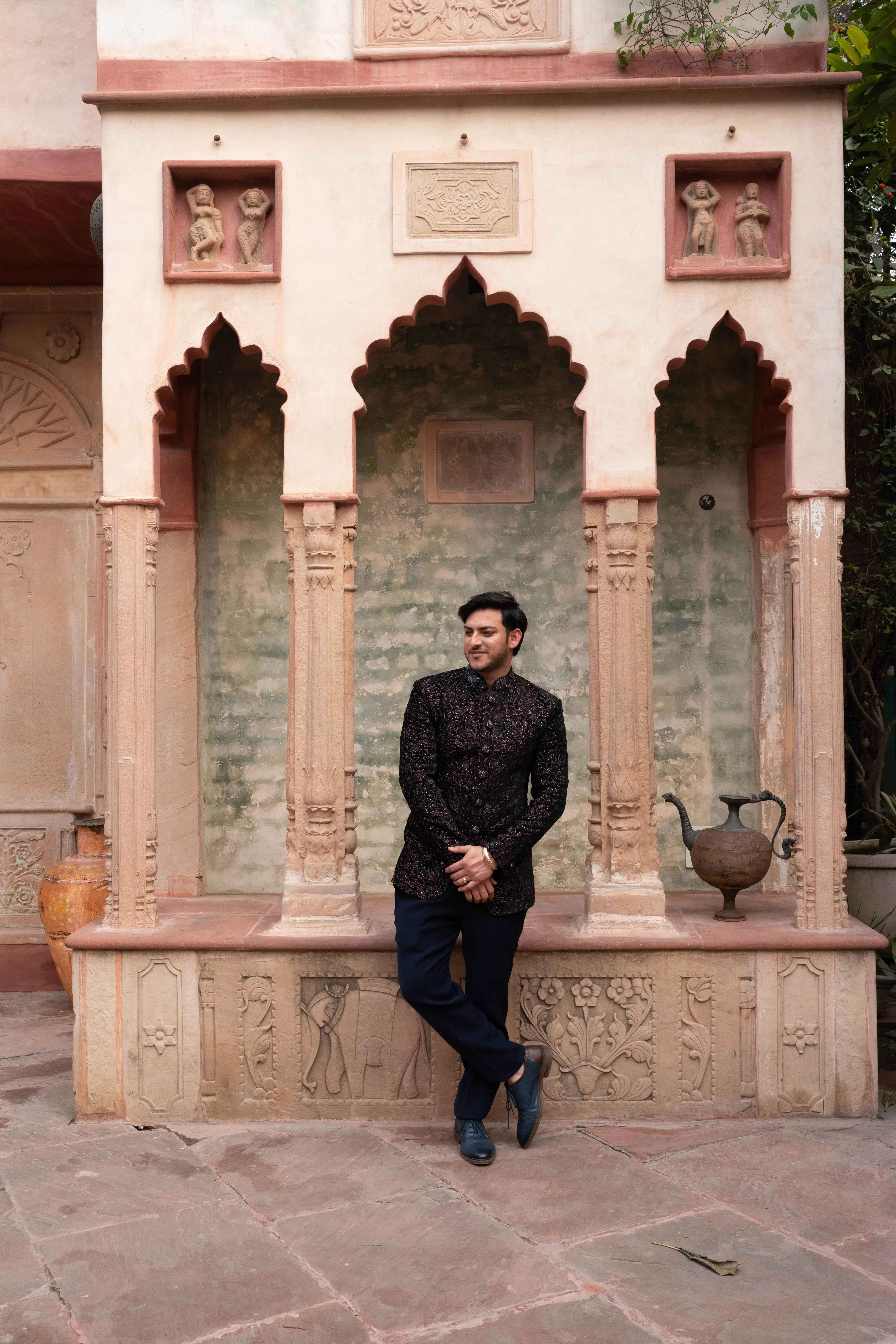 Look regal and refined with our Midnight Bloom Velvet Embroidered Bandhgala for Men. This statement piece is ideal for weddings, receptions, and festive occasions. The deep midnight hue paired with exquisite floral embroidery creates a timeless and luxurious appeal, while the plush velvet fabric ensures comfort and class.