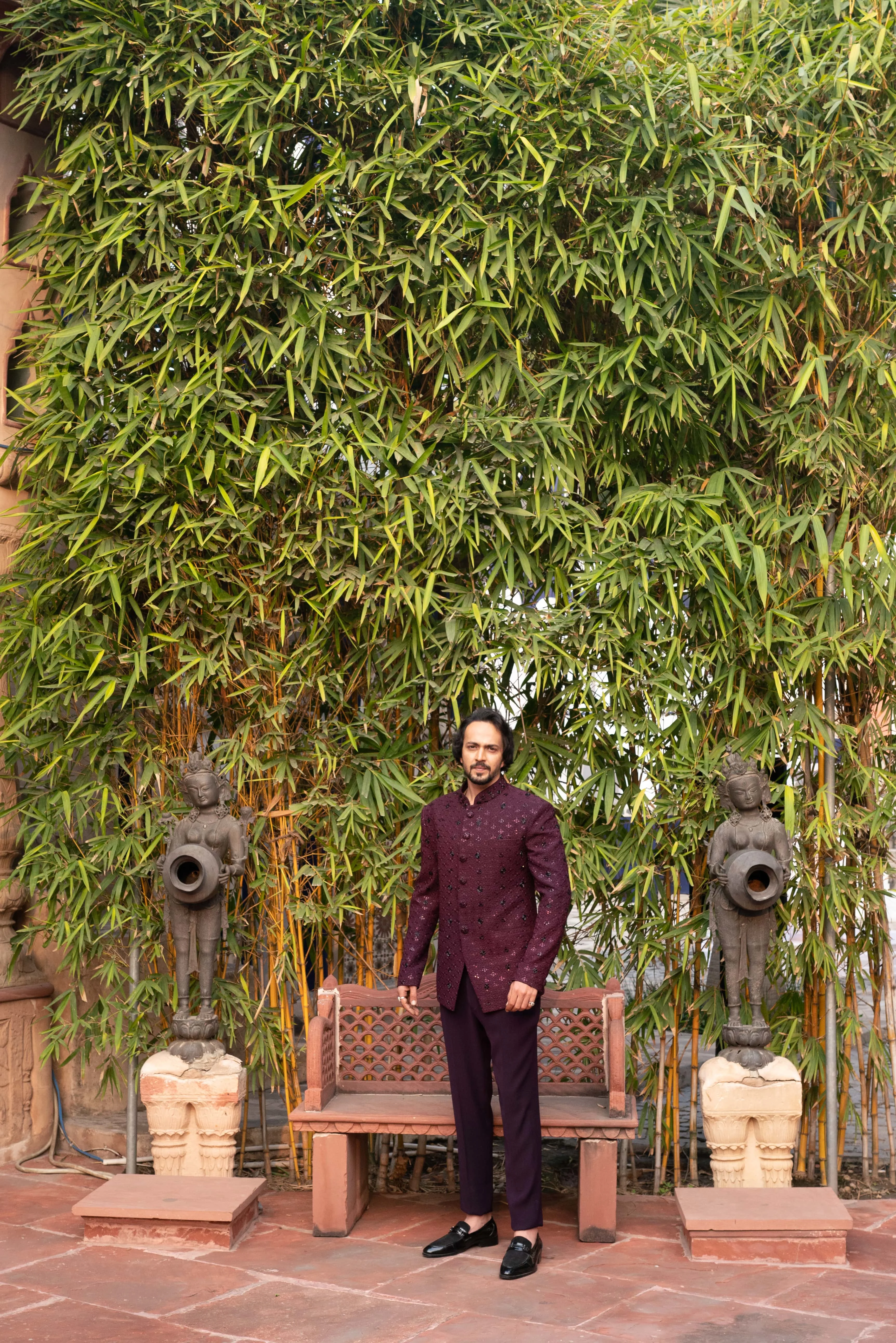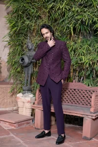 Look elegant and regal with our Plum Royale Sequin Embellished Bandhgala for Men. This striking outfit is ideal for weddings, receptions, and festive occasions. The rich plum color brings a luxurious feel, while the sequin embellishments add a modern, sophisticated sparkle.