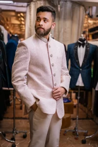 Look regal and sophisticated with our Royal White Embroidered Bandhgala Suit. This suit is perfect for weddings, receptions, and grand celebrations. The pure white color adds a touch of royalty, while the fine embroidery brings in an element of luxury and tradition.