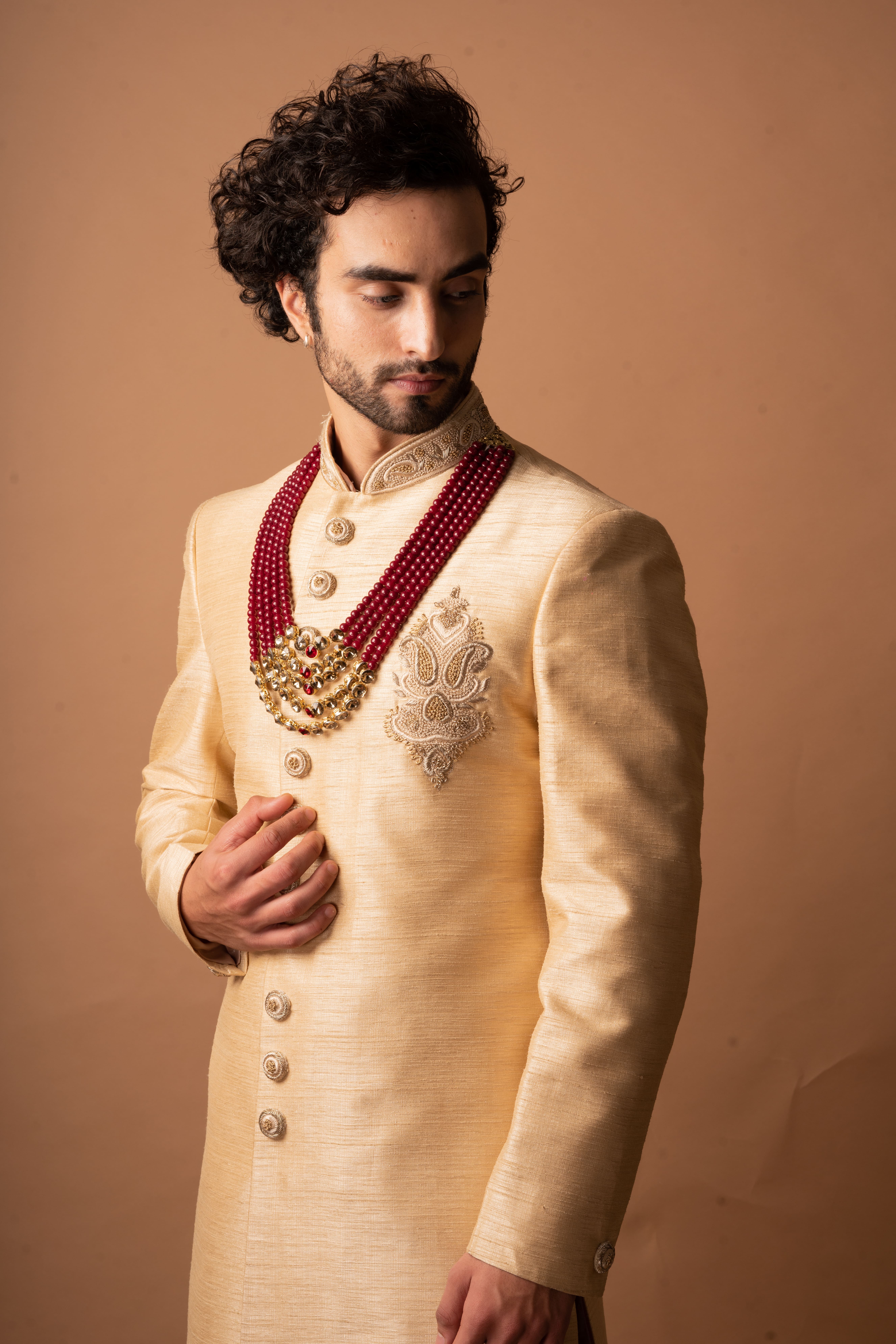 At Men Wedding Wear, we use a variety of high-quality fabrics for our sherwanis, including silk, brocade, velvet, and cotton blends. Each fabric is carefully selected for its elegance, durability, and comfort, ensuring you feel and look your best.