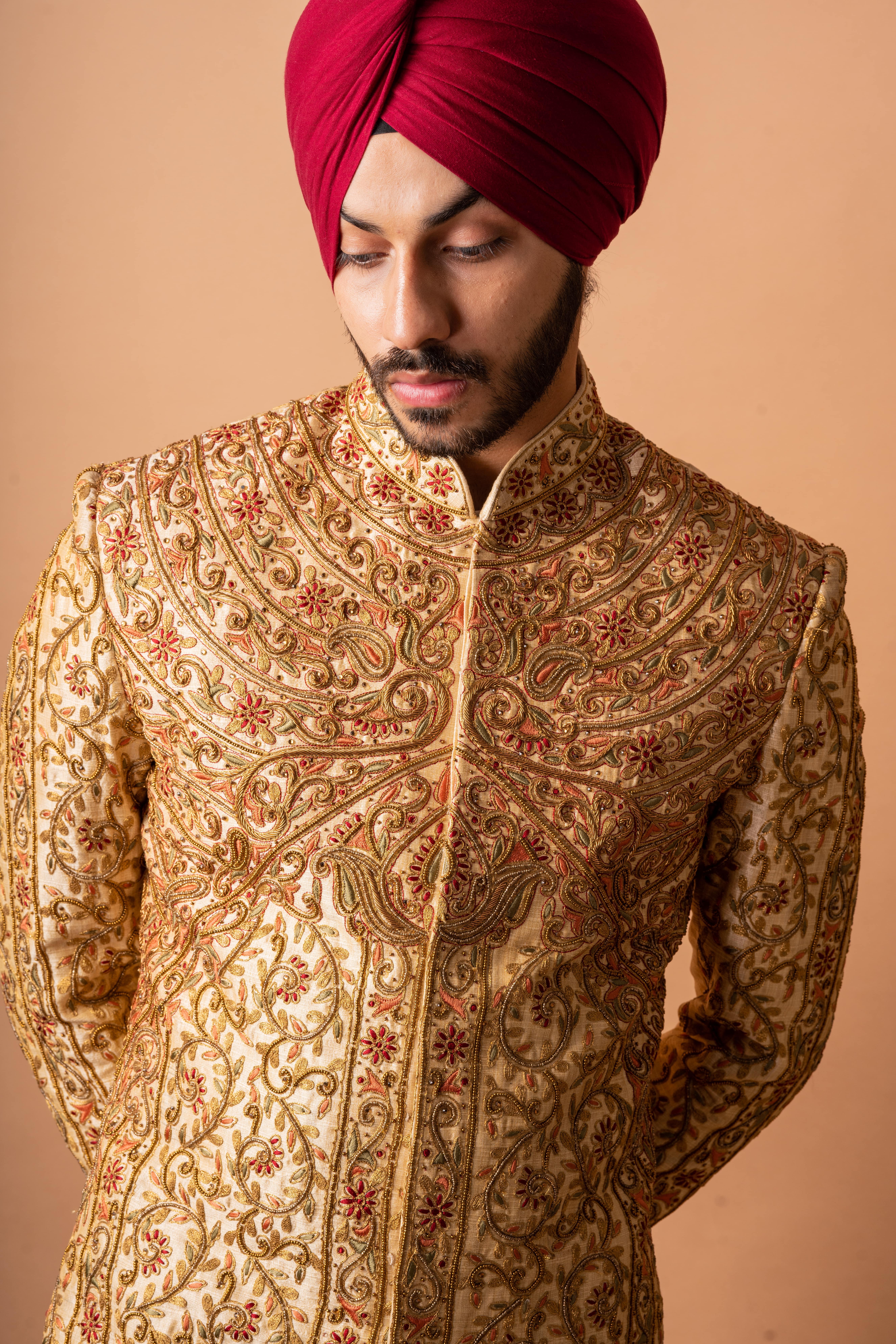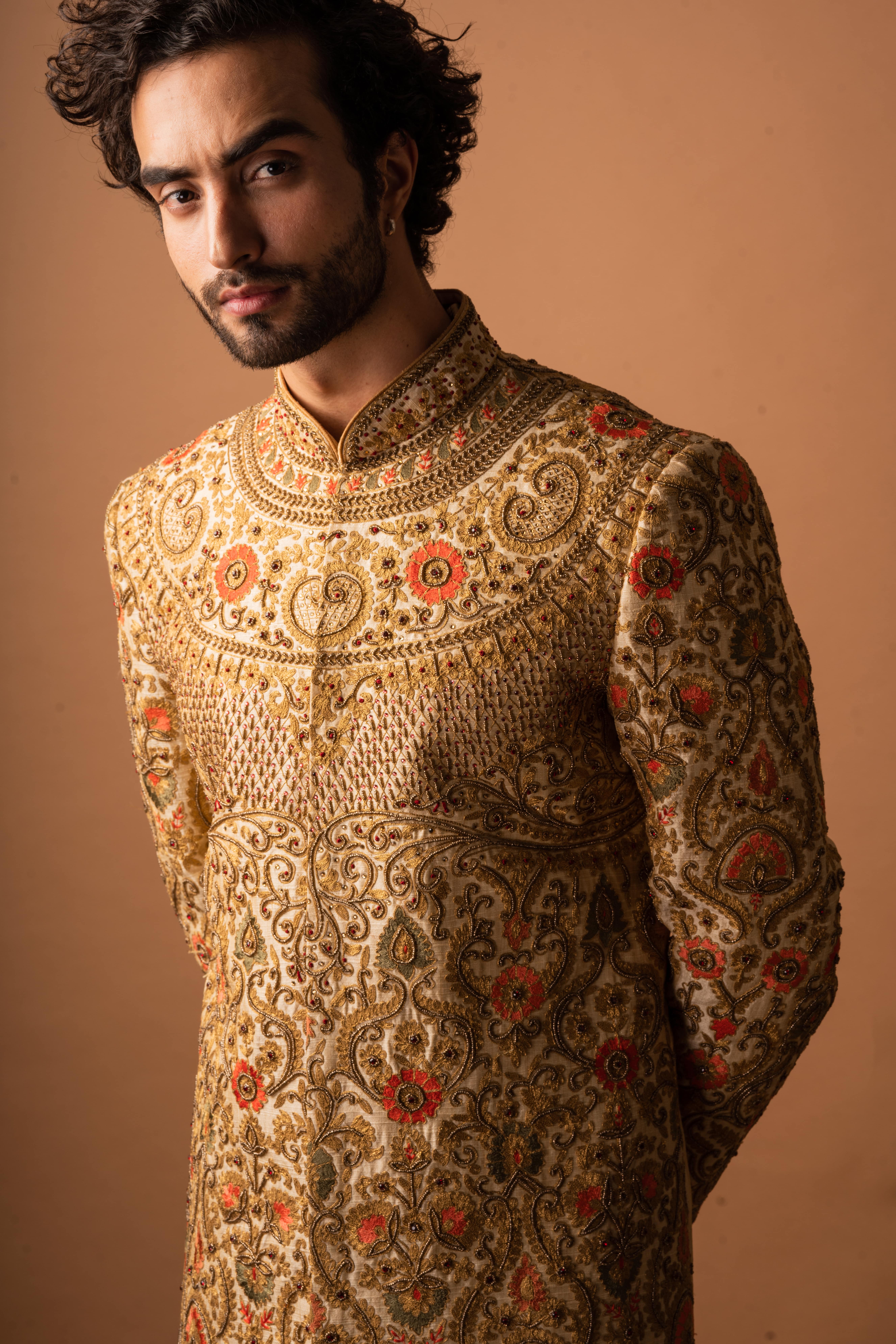 The timeline for a custom sherwani depends on the complexity of the design. Typically, it takes 3 to 4 weeks from consultation to final delivery. We recommend starting the process early to ensure ample time for adjustments.