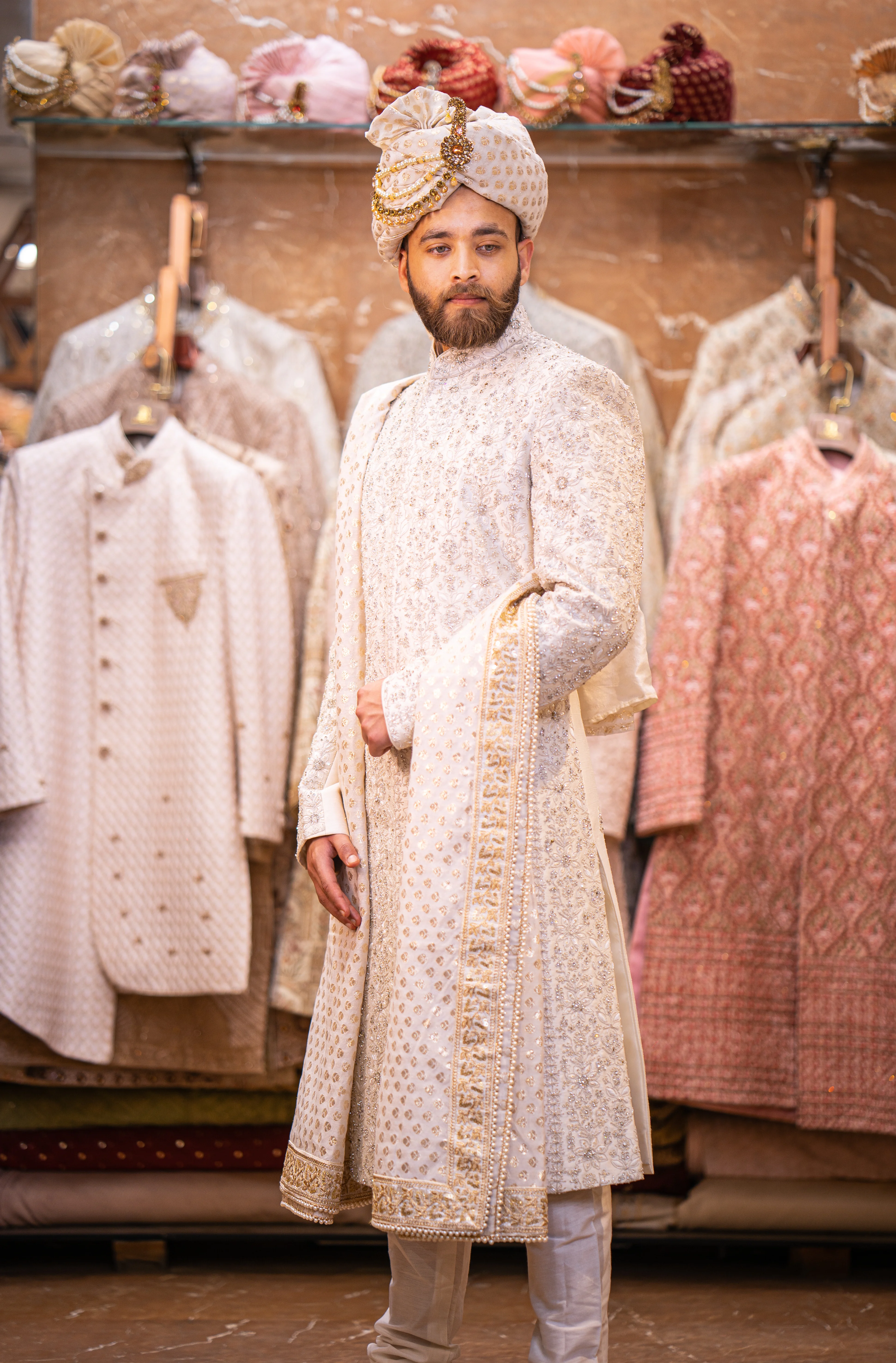 Yes, we offer a wide range of matching accessories that perfectly complement our sherwanis, including turbans, juttis, and stoles. Our team can help you choose accessories that enhance your overall look and create a cohesive wedding or event ensemble.